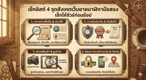 4 จุดสังเกตเว็บขายนาฬิกามือสองที่ต้องเช็กก่อนช้อป ไม่เสี่ยงโดนโกงก่อนตัดสินใจใช้บริการเว็บขายนาฬิกามือสอง ผู้ซื้อควรให้ความสำคัญกับการคัดกรองความน่าเชื่อถือเป็นอันดับต้น ๆ เพื่อป้องกันความเสี่ยงจากมิจฉาชีพที่แฝงตัวเข้ามาในหลายรูปแบบ หากพิจารณาร้านรับซื้อนาฬิกาข้อมือบนออนไลน์อย่างถี่ถ้วนก็จะช่วยเพิ่มความมั่นใจในการทำธุรกรรมได้มากขึ้น ประเมินด้วยเช็กลิสต์นี้ก่อนตัดสินใจช้อปกับร้านนาฬิกาหรูมือสอง