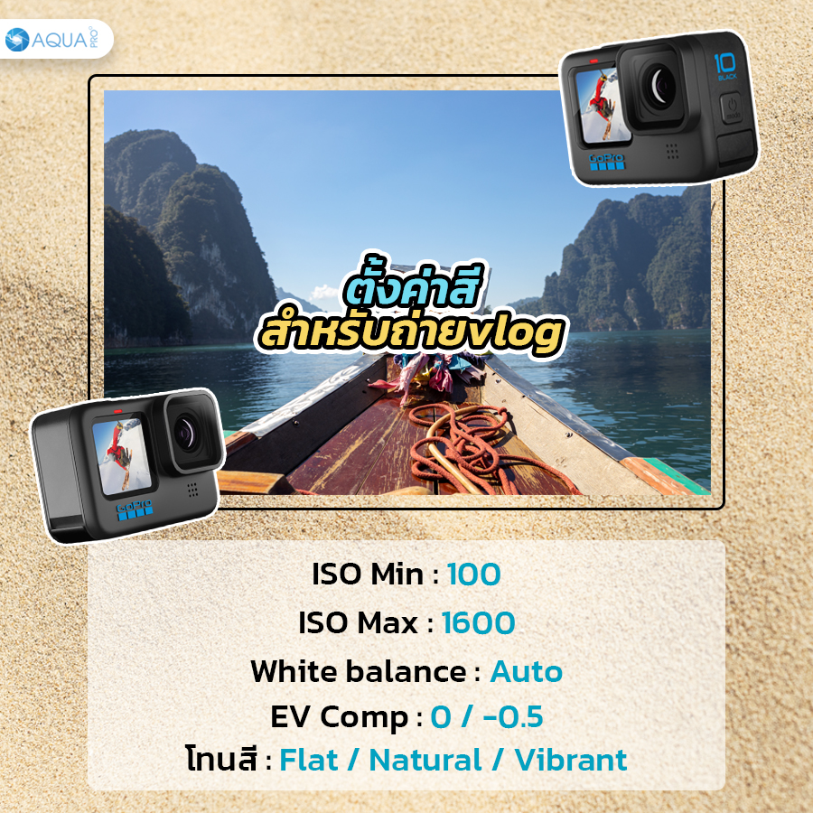 ตั้งค่าสี - ในส่วนของสีถ้าเป็น ISO Min : 100 และ ISO Max : 1600 (เหมาะสำหรับถ่ายในที่แสงน้อย) ในส่วน White balance จะเลือกเป็น Auto แต่จะเลือกตั้งค่า EV Comp : 0 / -0.5 เพราะว่าปกติเจ้าตัว GoPro 10 ค่อนข้างให้ความสว่างที่ดี บางครั้งหากถ่าย vlog กลางแจ้งก็อาจจะให้แสงที่มากเกินไป จึงต้องเปิดค่า EV เพื่อทำให้ภาพไม่สว่างจนเกินไป และ ในส่วนของโทนสีภาพก็สามารถเลือกได้ตามไลฟ์สไตล์ แต่สำหรับการถ่ายvlog ขอแนะนำ 3 โทนนี้