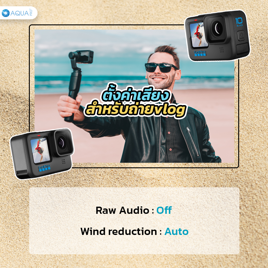 ตั้งค่าเสียง - ในส่วนของเสียงสามารถตั้งค่าเป็น Raw Audio : Off และ Wind reduction : Auto เพื่อให้เสียงที่ดีอาจจะต้องใช้อุปกรณ์เสริมอย่างไมโครโฟน เพราะว่าสำหรับการถ่าย vlog เสียงนับว่าเป็นสิ่งสำคัญไม่แม้คุณภาพของภาพเลย ถึงแม้โกโปรจะมีไมค์ในตัวแต่ก็ไม่ได้ดีมากเทียบเท่าการต่อกับไมค์เสริม