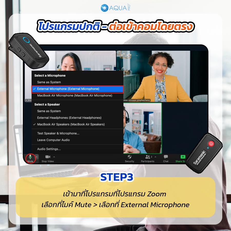 STEP3เข้ามาที่โปรแกรมที่เราต้องการ (เราจะยกกรณีใช้โปรแกรม Zoom) > เลือกที่ไมค์ Mute > เลือกที่ External Microphone เพียงเท่านี้เสียงของเราก็จะเข้าไปในโปรแกรมแล้ว (ให้ลองทำการใช้งานว่าเสียงเข้าไปหรือไม่)