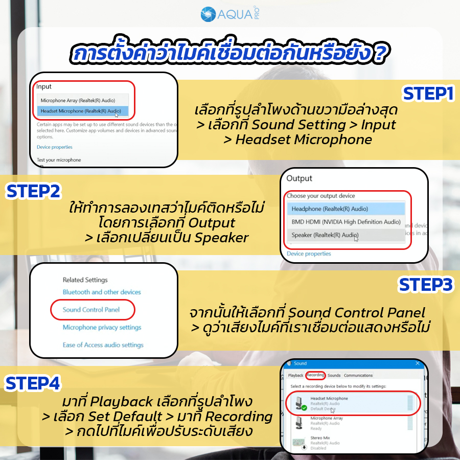 STEP4 - มาที่ Playback เลือกที่รูปลำโพง > เลือก Set Default เพื่อทำให้เสียงออกมาที่ลำโพงเป็นหลัก > มาที่ Recording จะเห็นไมค์ Headset แสดงขึ้นมา > กดไปที่ไมค์เพื่อปรับเลเวล และ คุณภาพของเสียงที่เราต้องการ เมื่อเราทำการตั้งค่าเสร็จให้ลองทำการบันทึกเสียง ว่าเสียงเข้าไปในไมค์หรือยัง