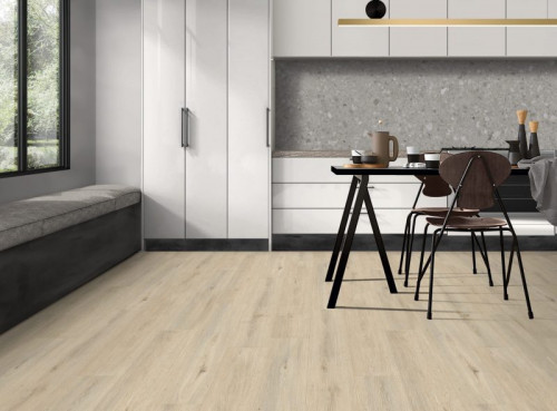 ใช้สีไม้โทนอ่อนหรือโทนอบอุ่นของกระเบื้องยางลายไม้ผสมกับผนังสีขาว ครีม หรือเทาอ่อน จะช่วยสร้างบรรยากาศสว่างและเป็นมิตร ให้ความรู้สึกโมเดิร์นแต่ไม่แข็งกระด้าง เพิ่มเฟอร์นิเจอร์ไม้และของตกแต่งโทนธรรมชาติจะยิ่งขับความอบอุ่น