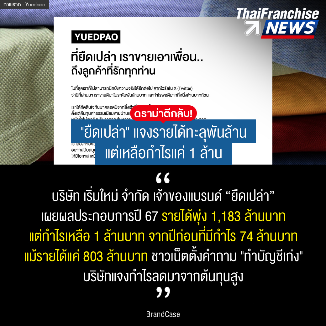 บริษัท เริ่มใหม่ จำกัด เจ้าของแบรนด์ “ยืดเปล่า” เผยผลประกอบการปี 67 รายได้พุ่ง 1,183 ล้านบาท แต่กำไรเหลือ 1 ล้านบาท จากปีก่อนที่มีกำไร 74 ล้านบาท แม้รายได้แค่ 803 ล้านบาท ชาวเน็ตตั้งคำถาม "ทำบัญชีเกง" บริษัทแจงกำไรลดมาจากต้นทุนสูง