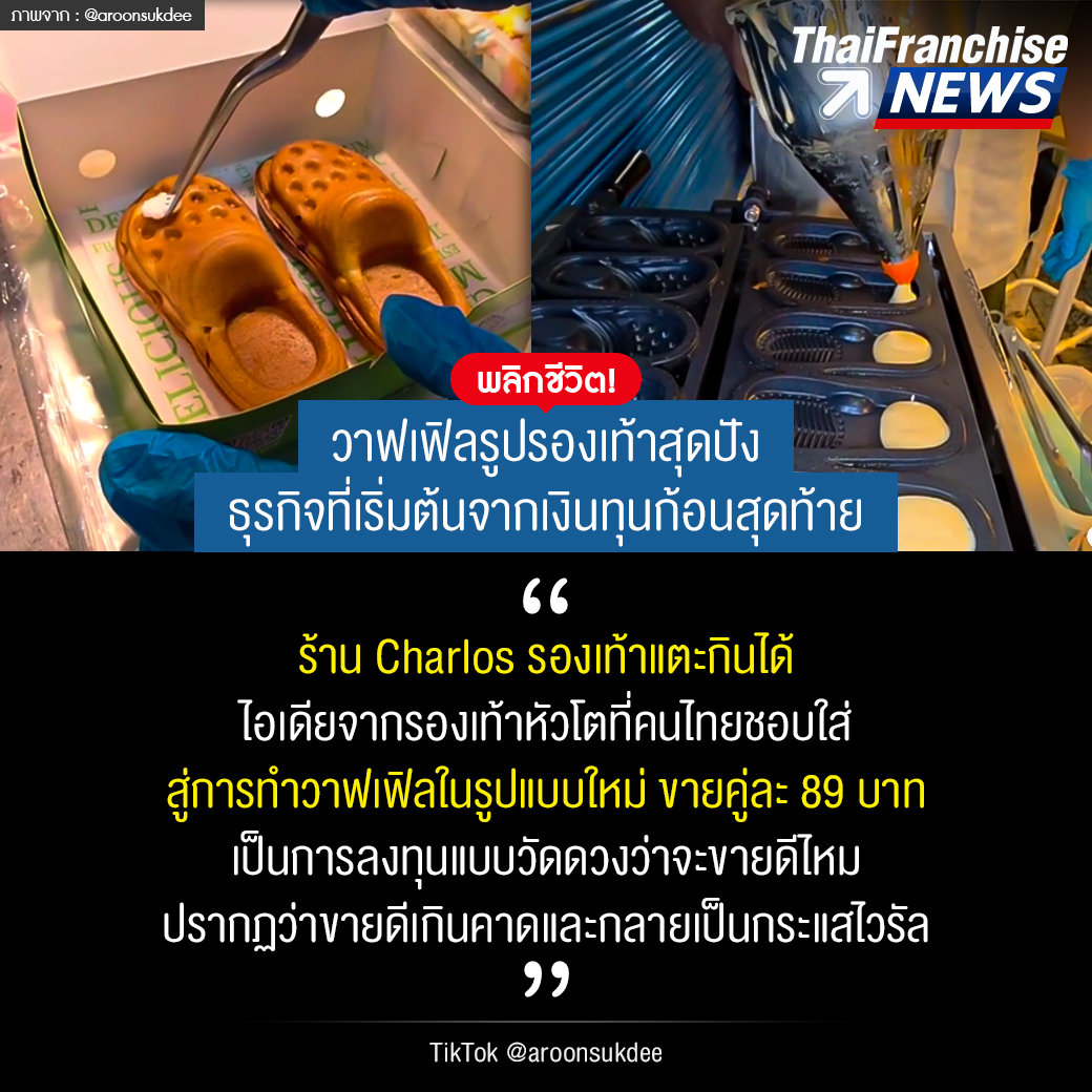 ร้าน Charlos รองเท้าแตะกินได้ ไอเดียจากรองเท้าหัวโตที่คนไทยชอบใส่ สู่การทำวาฟเฟิลในรูปแบบใหม่ ขายคู่ละ 89 บาท เป็นการลงทุนแบบวัดดวงว่าจะขายดีไหม ปรากฏว่าขายดีเกินคาดและกลายเป็นกระแสไวรัล