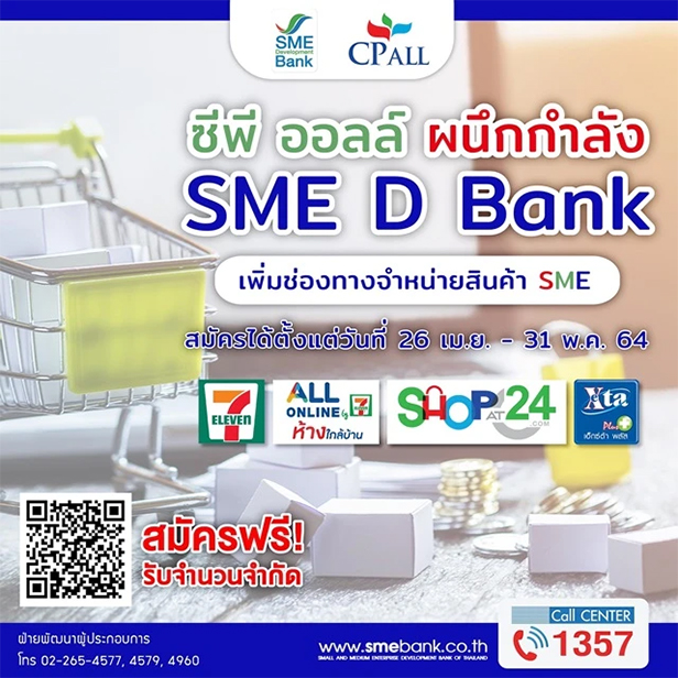 SME D Bank จับมือกับซีพี ออลล์ หนุนเอสเอ็มอีไทยเพิ่มรายได้ ลดผลกระทบโควิด-19 จัดโครงการ “เพิ่มช่องทางจำหน่ายสินค้า SME” เปิดโอกาสนำสินค้าขายผ่านร้านเซเว่น อีเลฟเว่น และช่องทางต่างๆ ของซีพี ออลล์ ทั้งออฟไลน์ และออนไลน์ รับสมัครเข้าคัดเลือกผ่านออนไลน์ ตั้งแต่วันที่ 26 เมษายน-31 พฤษภาคม 2564 นี้