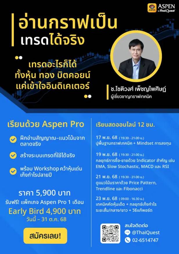 ThaiQuest ผู้ให้บริการ Aspen เครื่องมือวิเคราะห์ทางเทคนิค (Technical Analysis) ชั้นนำของไทย เปิดคอร์สเรียนสดออนไลน์ "อ่านกราฟเป็น เทรดได้จริง" เพื่อพัฒนาทักษะการวิเคราะห์กราฟเทคนิคตั้งแต่พื้นฐานจนถึงระดับมืออาชีพ พร้อม Workshop วิเคราะห์หุ้นจากเคสจริง สอนโดย อาจารย์ ช.โชติวงศ์ เพ็ชญไพศิฐ์ วิทยากรผู้เชี่ยวชาญด้าน Technical Analysis และนักลงทุนมากประสบการณ์