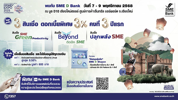 SME D Bank ยกขบวน ‘พัฒนาคู่เติมทุน’ ร่วมงาน ‘Money Expo เชียงใหม่ 2025’ มอบโปรโมชันดันเอสเอ็มอีคว้าโอกาสเติบโตจากนโยบาย Quick Big Win
