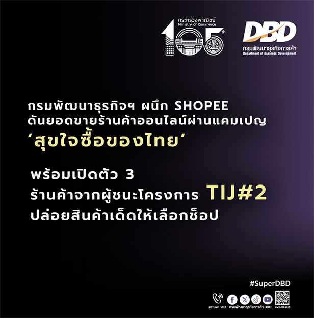 กรมพัฒนาธุรกิจฯ ผนึก Shopee ดันยอดขายร้านค้าออนไลน์ผ่านแคมเปญ ‘สุขใจซื้อของไทย’ พร้อมเปิดตัว 3 ร้านค้าจากผู้ชนะโครงการ TIJ#2 ปล่อยสินค้าเด็ดให้เลือกช็อป