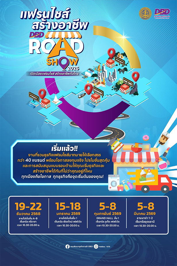 โอกาสสร้างอาชีพ สร้างรายได้ ด้วยธุรกิจแฟรนไชส์! กรมพัฒนาธุรกิจการค้าขอเชิญผู้สนใจร่วมงานแฟรนไชส์สร้างอาชีพ Roadshow 2025 ที่รวมสุดยอดแฟรนไชส์กว่า 40 แบรนด์ทั่วไทยพร้อมโปรโมชั่นแพ็กเกจแฟรนไชส์สุดพิเศษ และโอกาสรับคำปรึกษาด้านเงินทุน