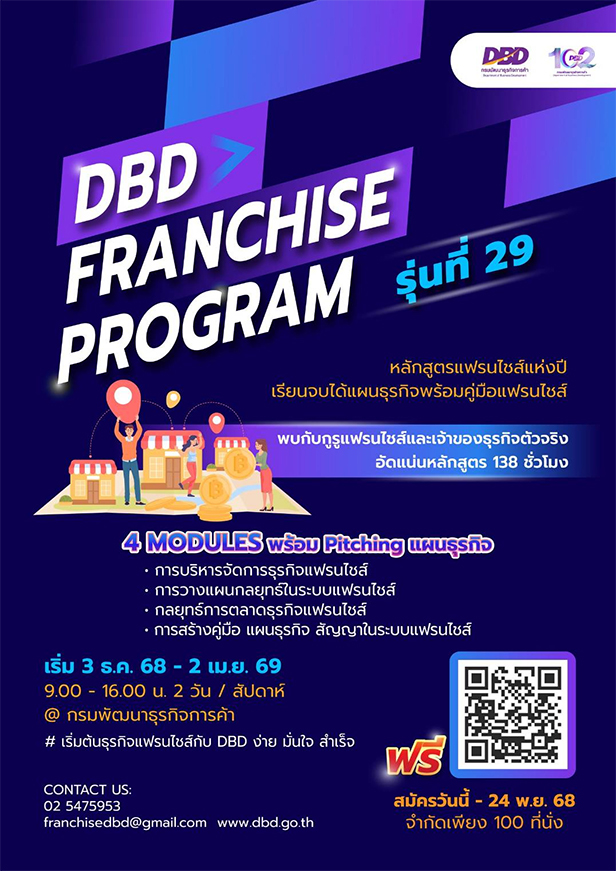 มาแล้ว DBD Franchise Program (DBD-FP)" รุ่นที่ 29 โอกาสของคนที่อยากเริ่มต้นธุรกิจแฟรนไชส์ "ฟรี" จัดปีละครั้งเท่านั้น