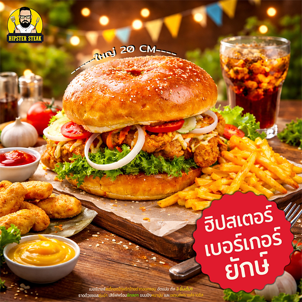 แฟรนไชส์ ฮิปสเตอร์ สเต็ก เปิดตัวเมนูใหม่ “เบอร์เกอร์ยักษ์” ใหญ่สะใจ ไก่ทอด 3 ชั้น!