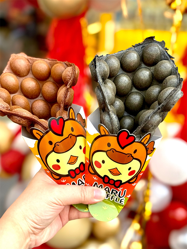 โดยมีเมนูวาฟเฟิลให้เลือกได้ตามต้องการ มีเมนูซิกเนเจอร์ที่น่าสนใจเช่น Caramel Egg Tart Bubble Waffle , The Famous Thai Dessert Series , Chocolate Dubai Bubble Waffle เป็นต้น