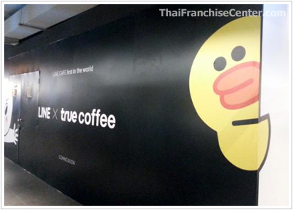 สำหรับไลน์คาเฟ่เป็นการทำแบรนด์คอลลาบอเรชั่น (Brand Collaboration) ร่วมกันระหว่างไลน์กับทรูคอฟฟี่ การดีไซน์ของร้านจะออกมาในรูปแบบโมเดิร์นคาเฟ่ ใช้ 2 สีหลัก คือ ขาวและดำ แบ่งโซนร้านด้านในเป็นคาเฟ่ ด้านนอกจะมีความเป็น Outdoor Street มีโต๊ะและเก้าอี้สำหรับลูกค้า