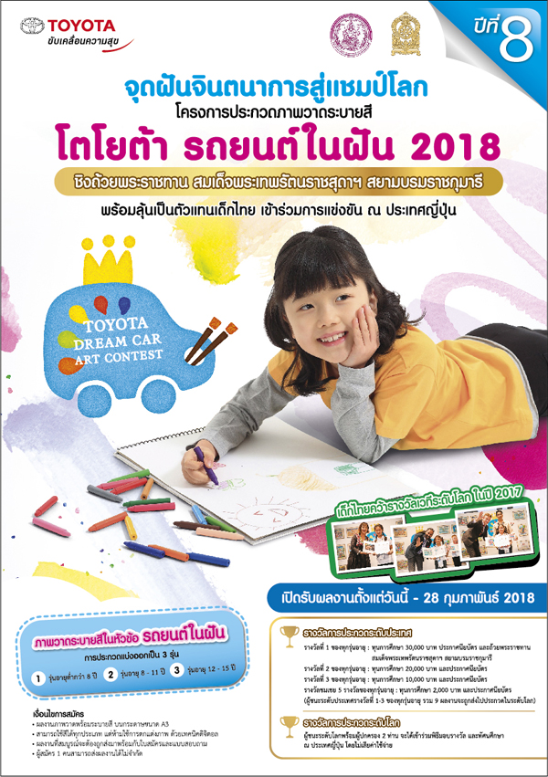 โตโยต้า มุ่งมั่นสานฝันเด็กไทยปีที่ 8 จัดประกวด TOYOTA DREAM CAR ART CONTEST 2018 ชิงถ้วยพระราชทาน สมเด็จพระเทพรัตนราชสุดาฯ สยามบรมราชกุมารี เฟ้นหาตัวแทนไปประกวดเวทีระดับโลก