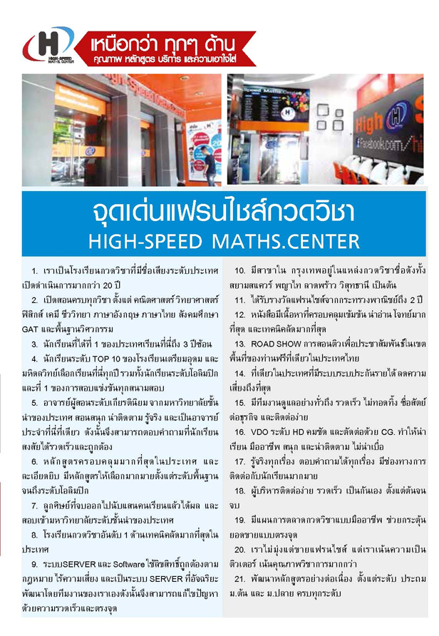 “ปัจจุบันมีแฟรนไชส์กวดวิชามากมาย แต่ เราเป็นเจ้าแรกของวงการกวดวิชา และเป็นที่เดียวที่ได้รับการโหวดเป็นอันดับ 1 ถึง 12 ปีซ้อนเปิดดำเนินการมากว่า 23 ปีประสบการสอนมากกว่า 30 ปี การเลือกแฟรนไชส์ที่ดีนั้นควรเลือกที่ชื่อเสียง เพราะต้องไปแข่งกับกวดวิชาที่อื่นๆๆมากมาย เช่น เคมีอาจารย์อุ้ THE BRAIN ออนดีมาน ครูสมศรี Enconcept ดังนั้นเราต้องเลือกชื่อเสียงกวดวิชาระดับเดียวกันที่สามารถสู้กับเขาได้ สถาบัน ‘HIGH-SPEED MATHS.CENTER’ สอนโดยทีมอาจารย์มืออาชีพระดับเกียรตินิยมและเหรียญทองโอลิมปิก ผู้เชี่ยวชาญเฉพาะแต่ละวิชาเป็นผู้ถ่ายทอดบทเรียน สอนสนุก น่าติดตาม ทำเรื่องยากให้เป็นเรื่องง่าย สอนละเอียดเป็นระบบขั้นตอนพร้อมโจทย์ทุกบท โดยเปิดสอนตั้งแต่ชั้นประถมศึกษาปีที่6 จนถึงชั้นมัธยมศึกษาปีที่6 ครบทุกวิชา อาทิ คณิตศาสตร์ ฟิสิกส์ วิทย์ เคมี ชีวะ ภาษาอังกฤษ ไทย มีชื่อเสียงระดับประเทศด้านเทคนิคลัดอันดับ 1 ของประเทศ