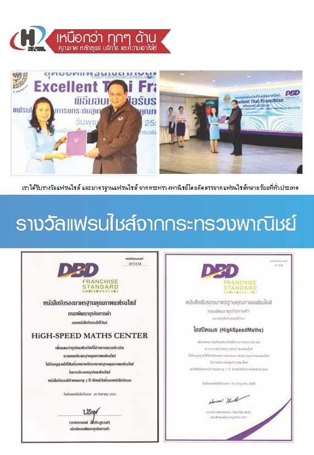 ด้วยระบบธุรกิจที่ได้รับการออกแบบเพื่อสร้างความสำเร็จยั่งยืนจนได้รับการโหวตเป็นแฟรนไชส์กวดวิชาอันดับ 1 ของประเทศ 12 ปีซ้อน และได้รับการคัดเลือกให้เป็นแฟรนไชส์ที่น่าลงทุนที่สุดแห่งปี และรางวัลอีกมากมายจากกระทรวงพาณิชย์ เป็นสิ่งยืนยันถึงความสำเร็จตลอดระยะเวลา 23 ปี ของแฟรนไชส์ HIGH-SPEED MATHS.CENTER เมื่อตัดสินใจร่วมธุรกิจแล้วไม่ผิดหวังอย่างแน่นอน นอกจากความมั่นคงแล้วยังมีส่วนช่วยสนับสนุนอนาคตของชาติให้มีความรู้ความสามารถทัดเทียมอารยะประเทศ และพัฒนาไม่หยุดยั้ง