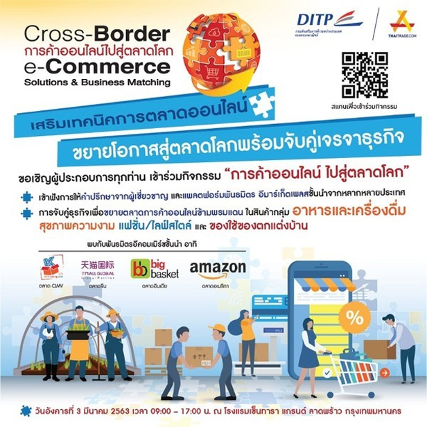 กรมส่งเสริมการค้าระหว่างประเทศ (DITP) กระทรวงพาณิชย์จับมือพันธมิตรออนไลน์ชั้นนำ ได้แก่ Kha-leang (ตลาด CLMV), Tmall Global Partner (ตลาดจีน), BigBasket (ตลาดอินเดีย) และ Amazon (ตลาดอเมริกา) จัดกิจกรรม "Cross-Border e-Commerce Solutions & Business Matching" ณ กรุงเทพฯ เพื่อต่อยอดการส่งเสริมผู้ประกอบการให้สามารถขายสินค้าสู่ตลาดต่างประเทศ ผ่านร้าน TOPTHAI บนแพลตฟอร์มอีคอมเมิร์ซ