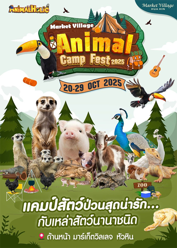“Animal Camp Fest 2025: Wild & Wonderful Creatures” at Market Village Hua Hin!AnimalHolic is setting up the ultimate animal camp, bringing over 10 days of hands-on fun, education, and unique encounters right to the heart of Hua Hin.Why bring your family? Up-Close Encounters: Safely feed and interact with adorable creatures—from meerkats and goats to colorful exotic birds! Amazing Shows: Be amazed by special animal talents and shows. Educational Fun: A great way for kids to learn about different species in a fun, outdoor setting.