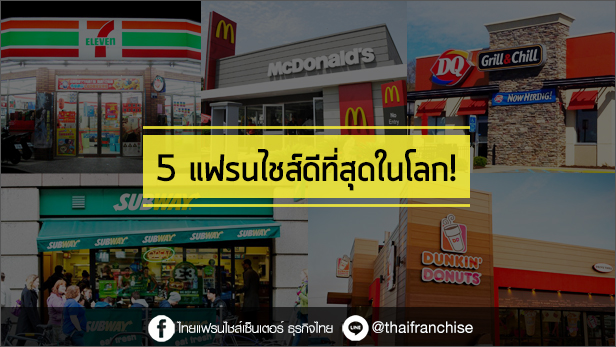 เว็บไซต์ Entrepreneur.com ได้จัดอันดับ 5 ธุรกิจแฟรนไชส์ที่ดีที่สุดในโลก จากรายชื่อแฟรนไชส์ 500 ในสหรัฐอเมริกา โดยพบว่าธุรกิจแฟรนไชส์ที่ติดอันดับ ล้วนเป็นแบรนด์แฟรนไชส์ที่ผู้คนทั่วโลกรู้จัก มีสินค้าและบริการเป็นที่ต้องการของตลาดและผู้บริโภค วันนี้ www.ThaiFranchiseCenter.com ไม่รอช้า จัดให้..