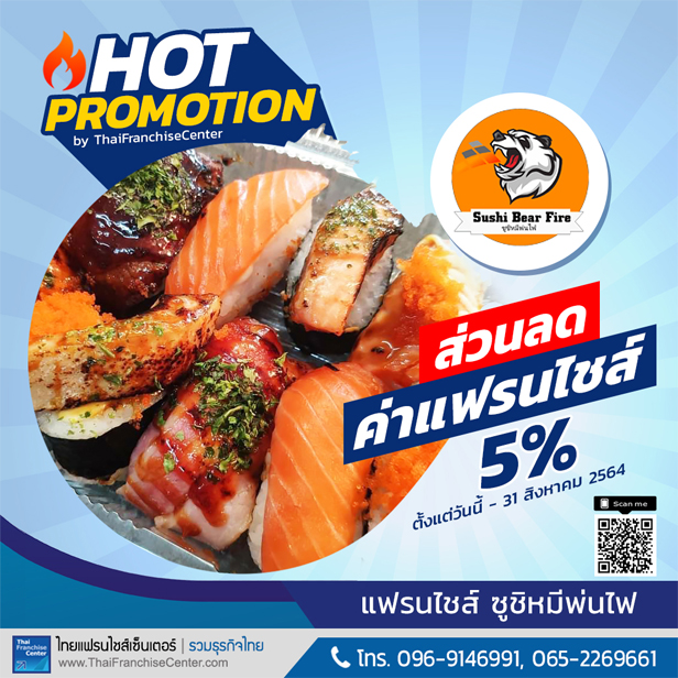 | ซูชิหมีพ่นไฟ | | ส่วนลด 5 % | เงื่อนไข : | สำหรับลูกค้าที่มาจากไทยแฟรนไชส์เซ็นเตอร์ 5 สาขาแรก รับส่วนลดค่าแฟรนไชส์ 5 เปอร์เซ็น | โทร. 096-9146991 |
