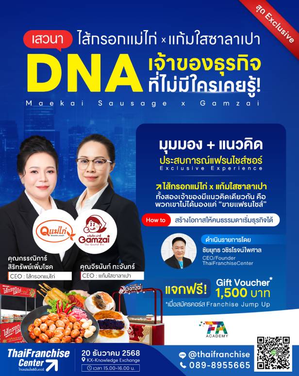"แฟรนไชส์" คือกลยุทธ์ต่อยอดธุรกิจ โดยอาศัยการขยายสาขา กระจายความสำเร็จ” แฟรนไชส์ไทยบางแบรนด์ ที่เริ่มจากการสร้างขึ้นมาเอง มักขาดความรู้ความเข้าใจอย่างแท้จริง ทำให้วางแผนไม่ถูกต้อง ซึ่งทำให้มีโอกาสเจ๊งสูง ภายใน 3 ปีแรกของการดำเนินธุรกิจ ดังนั้น สิ่งสำคัญคือการปูพื้นฐาน สร้างความรู้ และนำไปใช้ได้จริงในทันที!